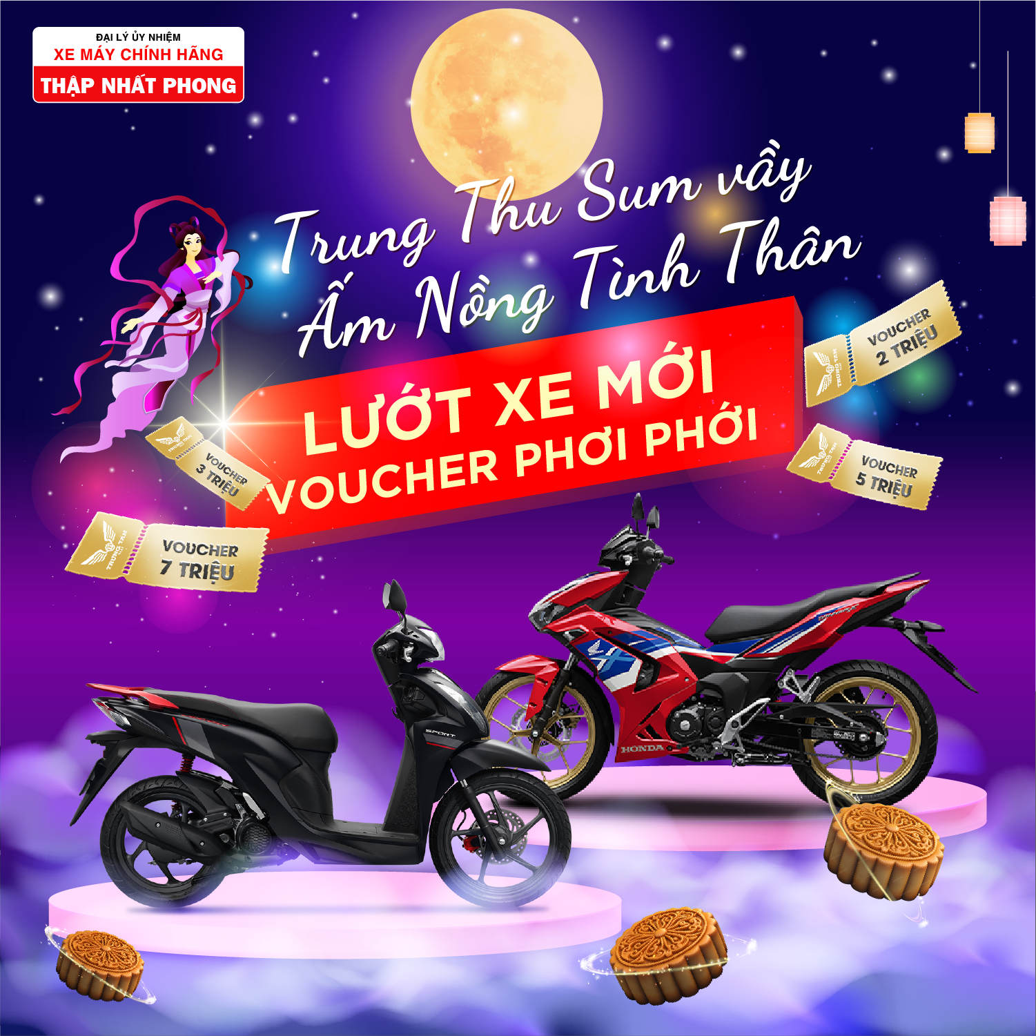 Mỗi dịp trung thu, mọi người lại náo nức trao nhau những món quà tình cảm gắn kết yêu thương. Nhân dịp ý nghĩa này, Thập Nhất Phong muốn thắt chặt thêm sự tri ân đối với khách hàng trân quý. Chương trình khuyến mãi mua xe máy mới và dịch vụ sửa chữa xe máy vô cùng sôi động. Quý khách sẽ được phục một cách hoàn hảo nhất trong mùa trăng sáng chiếu rọi nghĩa tình thâm giao.