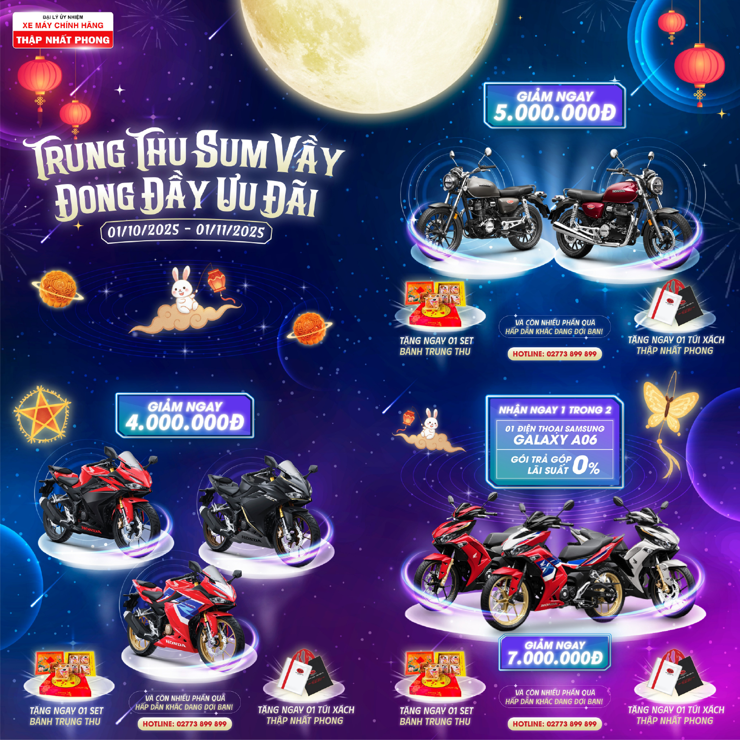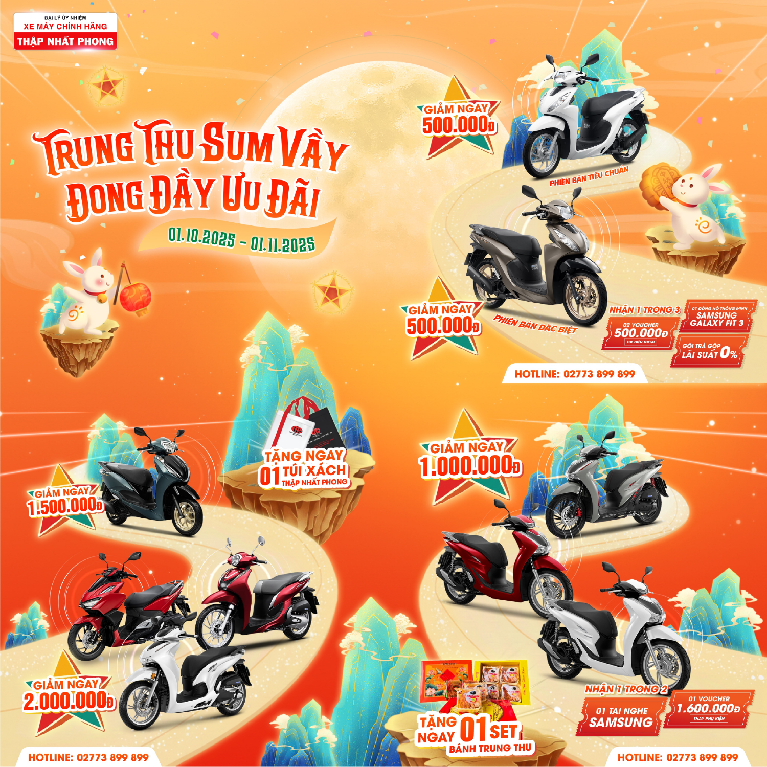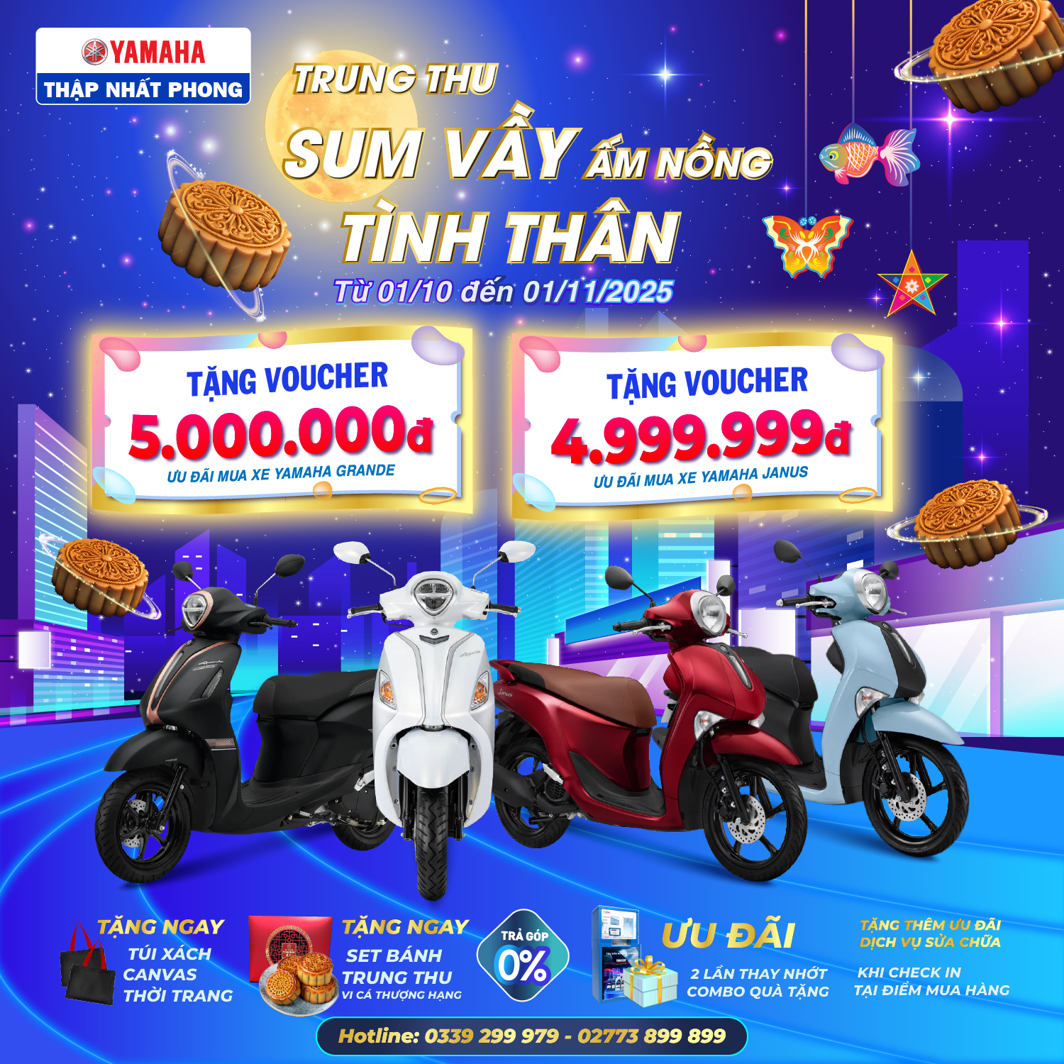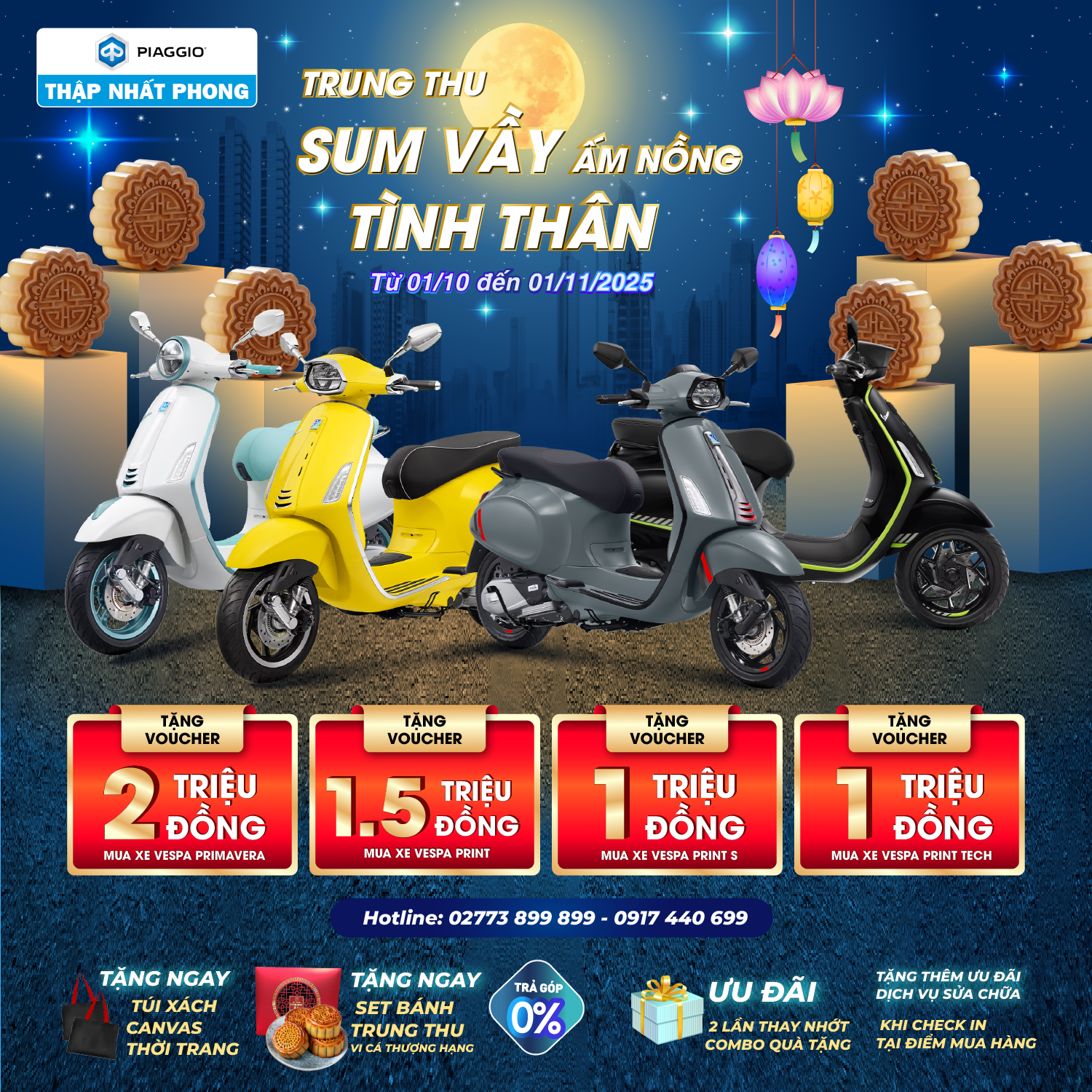 Hòa cùng không khí ấm áp của hội trăng rằm là cơ hội giúp khách hàng vừa có mùa trăng tròn đầy, vừa có trải nghiệm những khoảnh khắc du ngoạn tuyệt vời trên chiếc xe máy mới từ chương trình khuyến mãi “Trung thu sum vầy - Ấm nồng tình thân” với vô vàn voucher hấp dẫn diễn ra từ ngày 01/10/2025 đến hết ngày 01/11/2025.